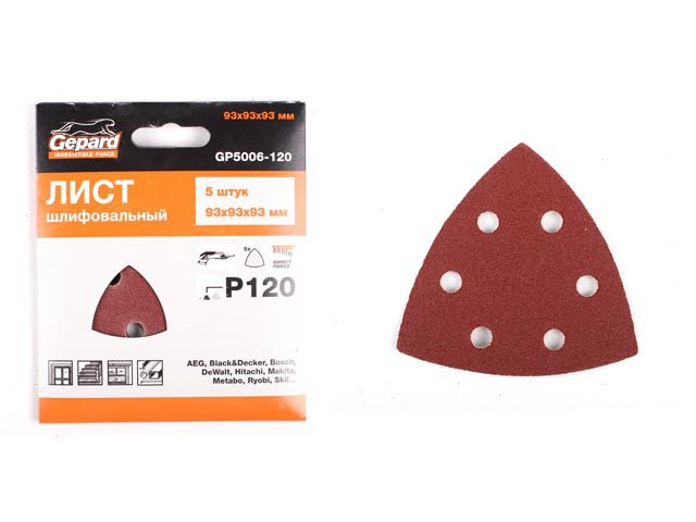 Шлифлист самосцепляющийся 93 мм Р180 для GDA GEPARD 5 штук (GP5006-180) имеет форму равностороннего треугольника со стороной 93 мм, применяется для дельташлифмашин и предназначен для шлифования фанеры, ДСП, МДФ и любых пород древесины. 6 технологических отверстий обеспечивают быстрое удаление пыли. 5 штук в упаковке.