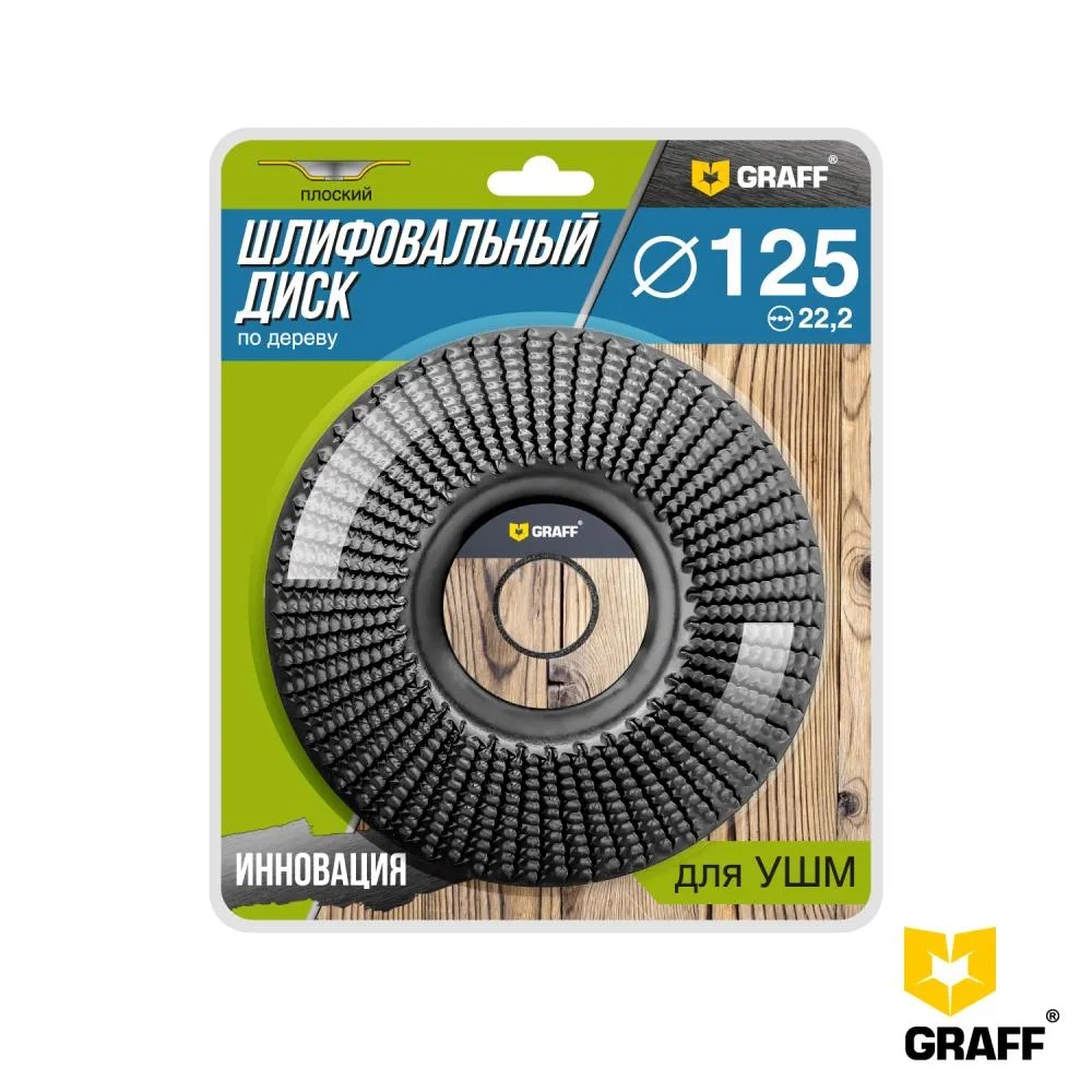 Шлифовальный диск по дереву (плоский) 125х22,23 мм GRAFF – это универсальный и эффективный инструмент для грубой обработки, шлифования плоскости, придания различной формы заготовкам из древесины, деревосодержащих материалов, пластмассы, гипса и резины.