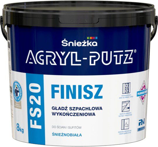 Шпатлевка полимерная финишная SNIEZKA Acryl-Putz FS20 Finisz белая 8 кг может применяться внутри помещений на бетонных, цементно-известковых, гипсовых, гипсокартонных основаниях. Готовая к употреблению шпатлевка наивысшего качества, особенно рекомендуется для завершительного, финишного выравнивания стен и потолков вручную и машинным способом. Во время применения сохраняет постоянную консистенцию, благодаря чему может применяться длительное время. Неизрасходованная масса в плотно закрытой упаковке сохраняет пригодность к дальнейшему применению. После высыхания исключительно легко шлифуется, сохраняя хорошие прочностные параметры. Оставляет белоснежные и идеально гладкие поверхности под покраску.