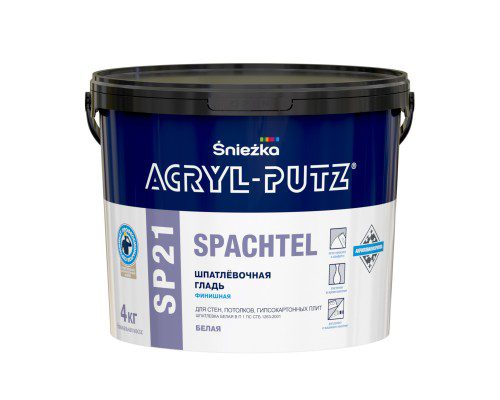 Шпатлевка белая ACRYL PUTZ SP21 SPACHTEL ШПАТЛЕВОЧНАЯ ГЛАДЬ ФИНИШНАЯ, 4 кг. Готовая шпаклевочная масса «Acryl-Putz Finisz» предназначена для работ внутри помещений, прежде всего для выравнивания бетонных стен и потолков, цементно-известковой, гипсовой штукатурки и отделочного шпаклевания гипсокартонных листов ручным и машинным методом. Особенно рекомендуется для завершительного, финишного выравнивания шероховатых стен из цементно-известковой штукатурки.