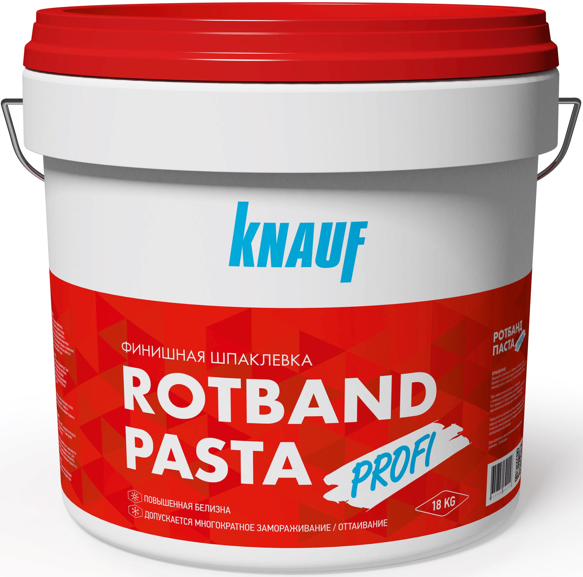 Шпатлевка полимерная финишная KNAUF Rotband Pasta Profi белая 18 кг применяется внутри помещений для финишного шпаклевания поверхности гипсокартонных или гипсоволокнистых листов, оштукатуренных и бетонных поверхностей, пазогребеневых плит, стеклохолста при подготовке под высококачественную окраску, оклейку обоями, перед нанесением венецианской штукатурки и других финишных материалов.