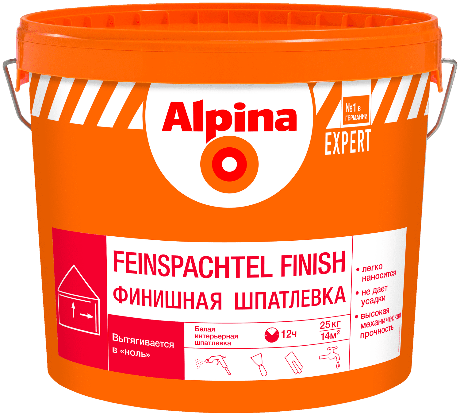 Шпатлевка полимерная финишная ALPINA Expert Feinspachtel Finish белая 25 кг предназначена для нанесения на известково-цементные штукатурки, бетон, гипсовые штукатурки и шпатлевки, гипсокартон, старые матовые дисперсионные краски. Подложки должны быть прочными, чистыми, сухими, обладать несущей способностью и не содержать веществ, препятствующих адгезии. Гипсовые подложки, основания с легкой осыпью, крупнопористые, сильновпитывающие необходимо предварительно прогрунтовать грунтовками Alpina EXPERT. Новые известково-цементные штукатурки обрабатывать только через 2-4 недели.