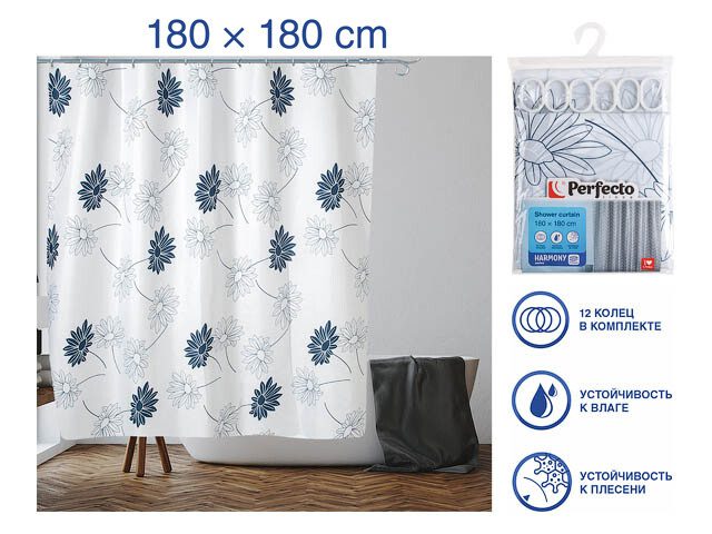 Штора для ванной комнаты 180х180 с кольцами PERFECTO LINEA Harmony цветы (36-118015) изготовлена из плотной полиэстерной ткани повышенной прочностью. Обработана глубокой нанотехнологичной водоотталкивающей и антибактериальной пропиткой, исключающей появление плесени. Фотопринт передает четкую цветопередачу, рисунок со временем не тускнеет и не вымывается. Верхний край отделан люверсами из нержавеющей стали. Допускается ручная или машинная стирка при температуре 30 градусов по Цельсию.