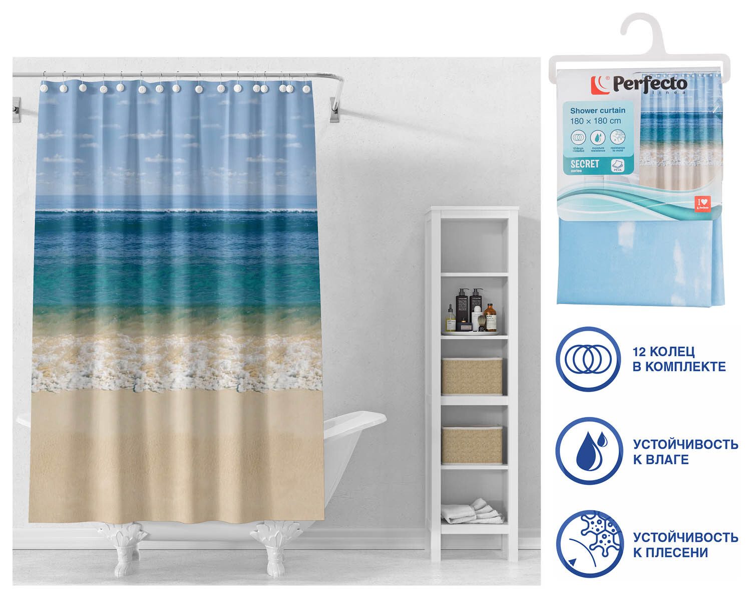 Штора для ванной комнаты 180х180 с кольцами PERFECTO LINEA Secret пляж (36-118106) используется для ванной комнаты. Штора для ванны с оригинальным принтом освежит и украсит интерьер ванной комнаты. Красивая и яркая штора для ванной это прекрасный подарок на новоселье и любой праздник. Прочная, водонепроницаемая шторка изготовлена из высококачественного полиэтилена (PEVA). Штора комплектуется 12 пластиковыми колецами, которые подходят ко всем современным карнизам.