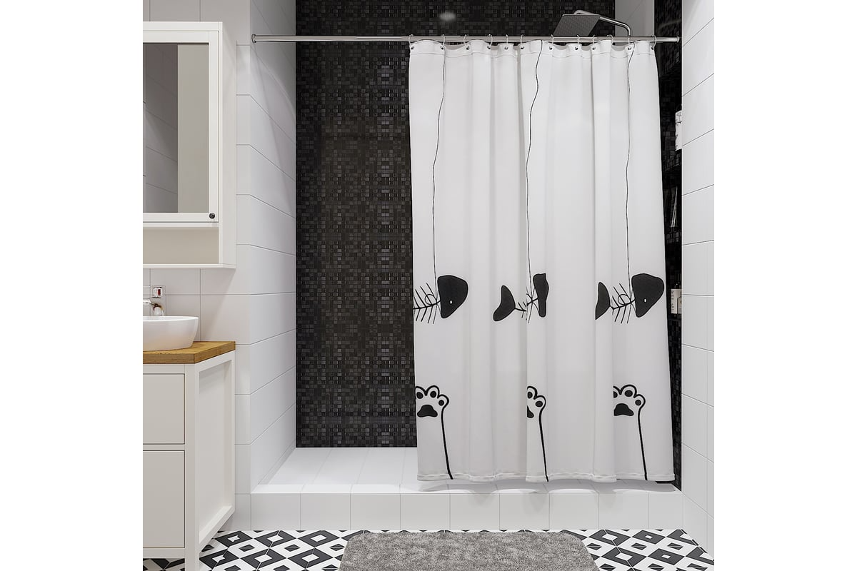 Черно-белый дизайн, в котором выполнена штора, прекрасно подходит для интерьера современной ванной комнаты, цвета не тускнеют и не вымываются.