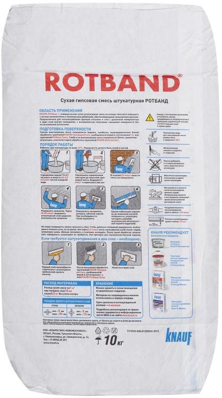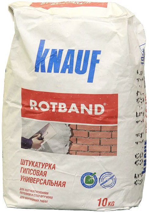 Штукатурка гипсовая KNAUF Rotband под окраску 10 кг предназначена для высококачественного оштукатуривания потолков и стен из бетона, кирпича, цементной штукатурки, поверхностей из пенополистирола, ЦСП. Рекомендуется для гладких бетонных потолочных и стеновых поверхностей. Штукатурка подходит для отделки помещений с нормальной влажностью, а также в кухнях и ванных комнатах с покрытием, обеспечивающим защиту от увлажнения. Предназначена для внутренних работ.