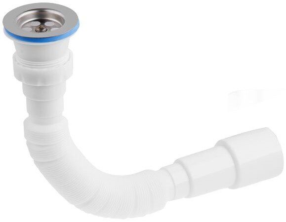 Гофросифон, выпуск 64 ммВыпуск и винт из нержавеющей стали 304, разборнойДлина винта 70 ммВыход в канализацию гибкая труба 1 1/2″- 40/50 мм, длина 780 мм