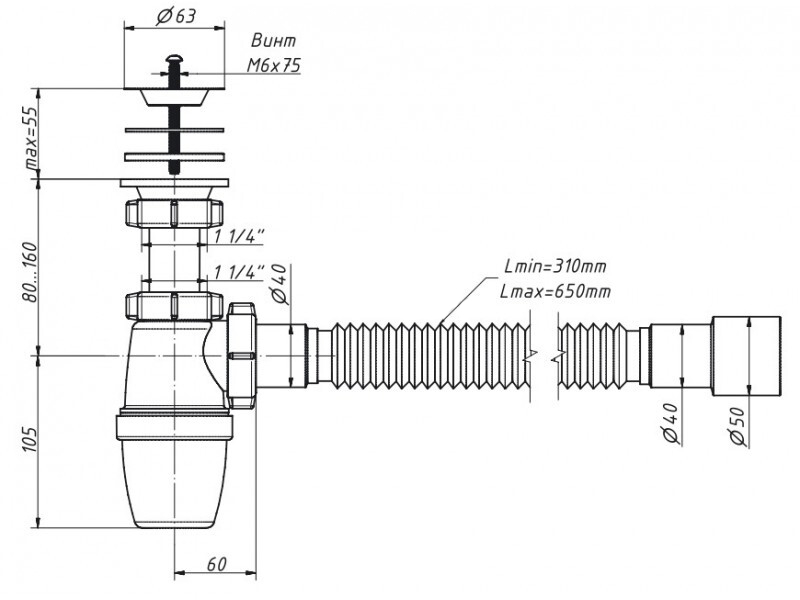 Сифон для умывальника 1 1/4х40 с нержавеющей решеткой и гибкой трубой ОРИО (А-3202) с малым корпусом. В комплекте к сифону идёт полированная нержавеющая чашка Ø 63 мм. Сифон комплектуется нержавеющим винтом длиной 75 мм и нержавеющей гайкой. Длина отвода в канализацию от 310 до 650 мм. Отвод имеет два диаметра подключения к канализации 40 и 50 мм.