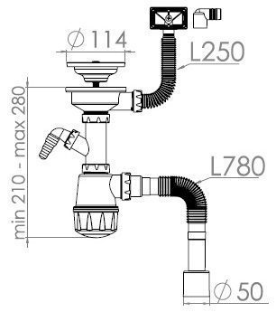 Сифон для кухни AV ENGINEERING (AVE129740) бутылочного типа, с большой колбой, с разборным выпуском 114 мм, с вертикальным и горизонтальным переливом. Выпуск из нержавеющей стали 304. Штуцер: латунный. Длина штуцера: 25 мм. Выход в канализацию гибкая труба 1 1/2″- 40/50 мм.