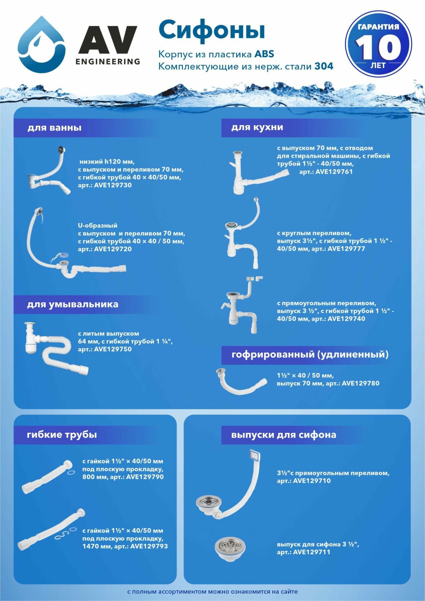 Сифон для кухни выпуск D70 гибкая труба 1 1/2"- 40/50 мм AV ENGINEERING (AVE129761) купить в сети строительных магазинов Мастак