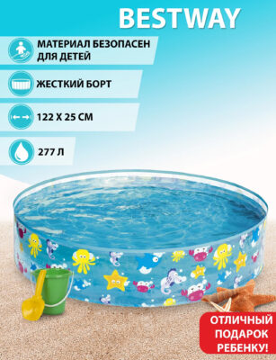 Бассейн BESTWAY Fill ‘N Fun Sparking Sea 55028 (122х25) изготовлен из высококачественного винила. Устойчивый, надежный и безопасный. Перед установкой выберите плотную и ровную поверхность, без острых камешков и прочих предметов. Бассейн не нуждается в подготовке, его не надо надувать, необходимо достать из коробки развернуть, а затем залить водой.