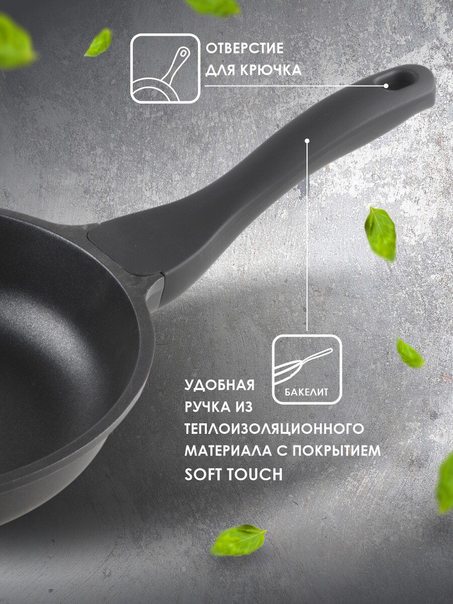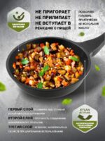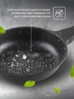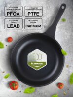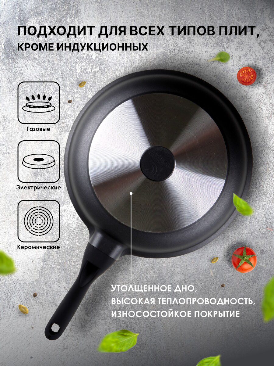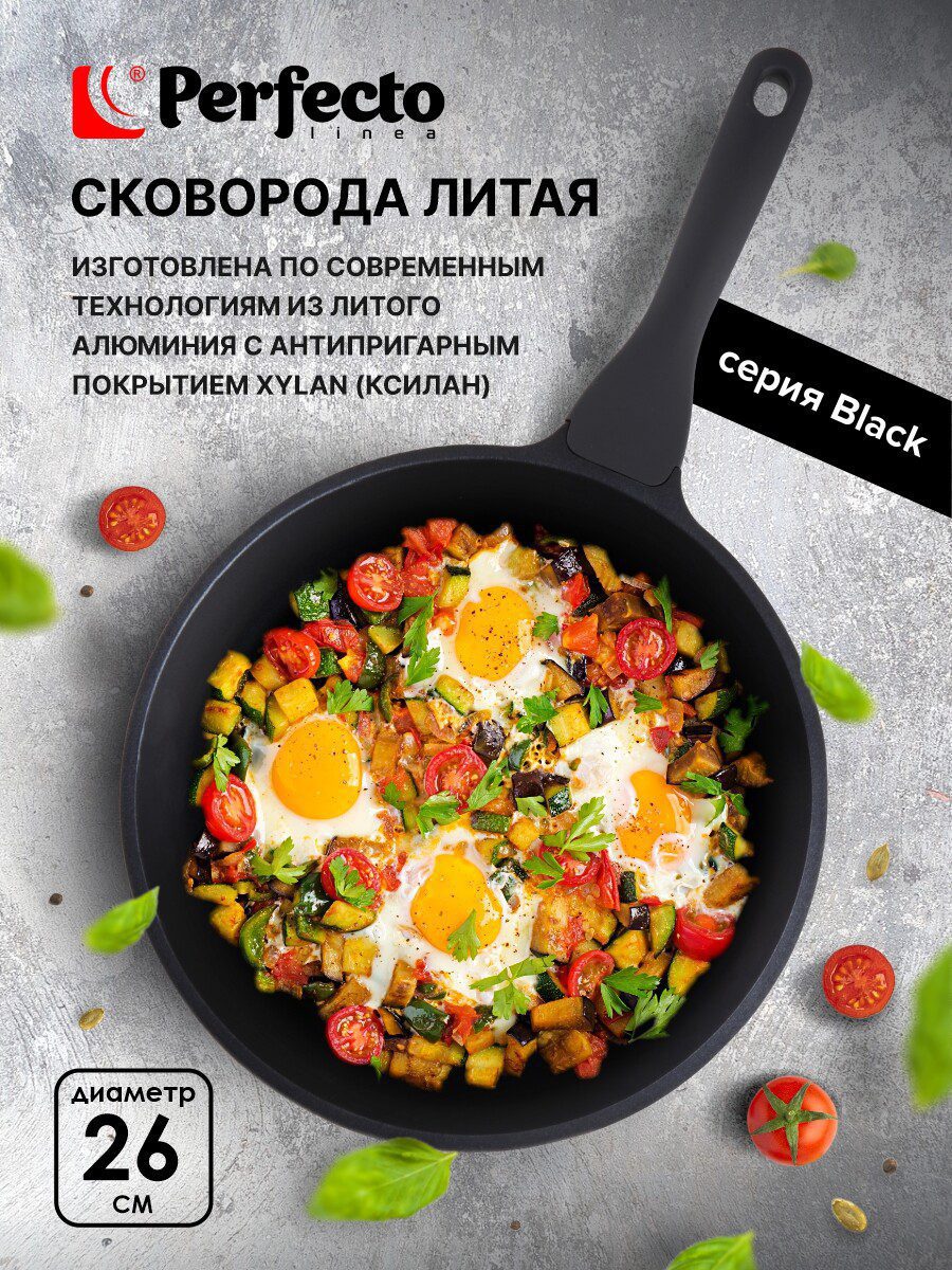 Сковорода алюминиевая 26 см PERFECTO LINEA Black (55-260013) изготовлена из литого алюминия с покрытием Xylan, что исключает возможность деформации и гарантирует долгий срок службы. Модель имеет трехслойное антипригарное покрытие: один слой полимера обеспечивает устойчивость к царапинам, второй — прочность соединения антипригарного покрытия, третий — усиление антипригарных свойств при длительном использовании. Покрытие не вступает в реакцию с пищей, а потому абсолютно безвредно для человека даже при попадании частичек в пищеварительный тракт. Сковорода обладает таким свойством, как PTFE “Easy-Clean”. Антипригарное покрытие позволяет готовить практически без масла. Бакелитовая рукоятка сковороды не нагревается. Подходит для всех типов плит, за исключением индукционных.