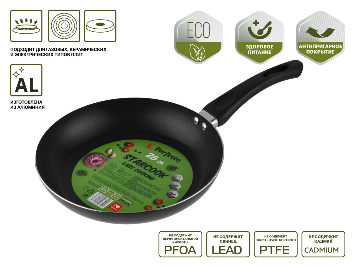 Сковорода алюминиевая 26 см PERFECTO LINEA Starcook черная (56-260452) изготовлена из алюминия с антипригарным покрытием Non-Stick Coating, без использования перфтороктановой кислоты (PFOA). Не содержит свинец (LEAD), кадмий (CADMIUM), перфтороктановую кислоту (PFOA), политетрафторэтилен (PTFE). Не загрязняет окружающую среду. Подходит для газовых, керамических и электрических типов плит.