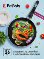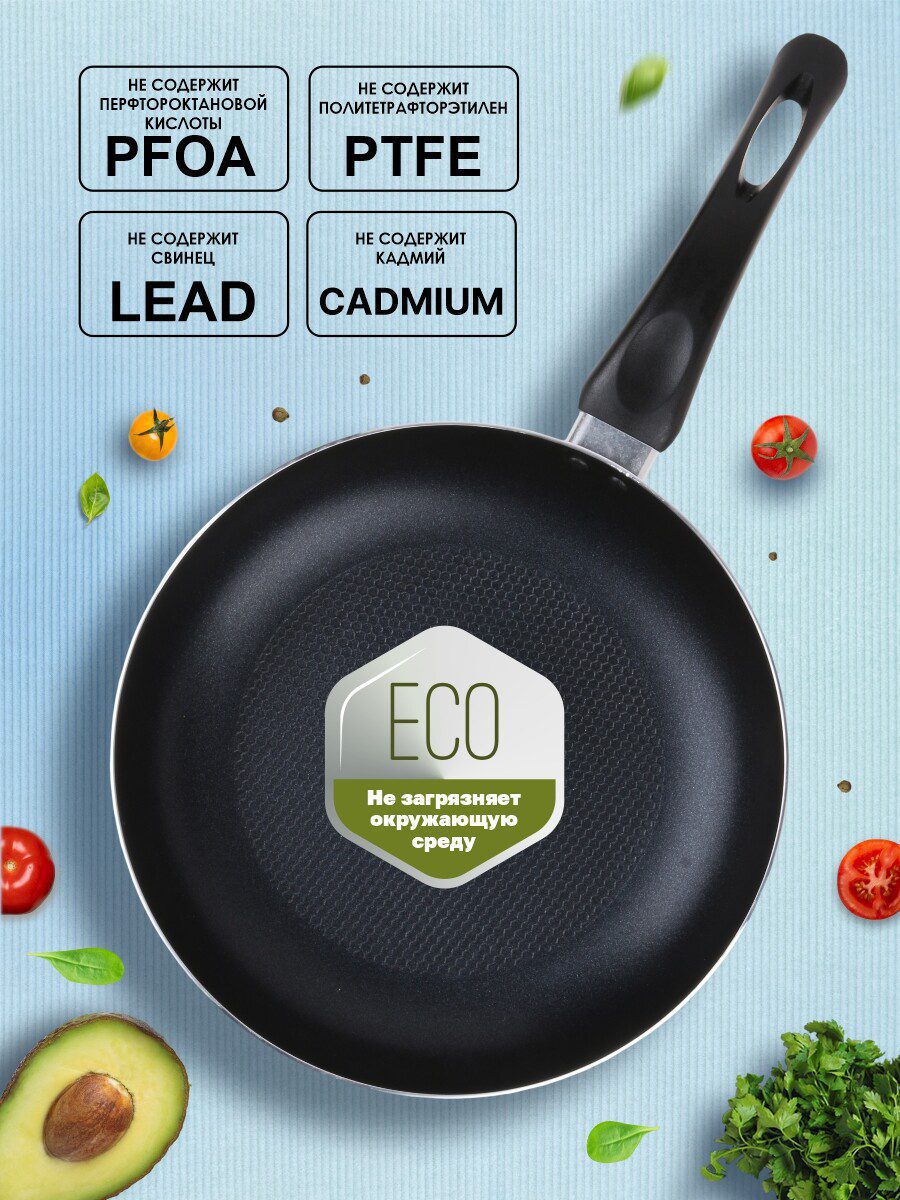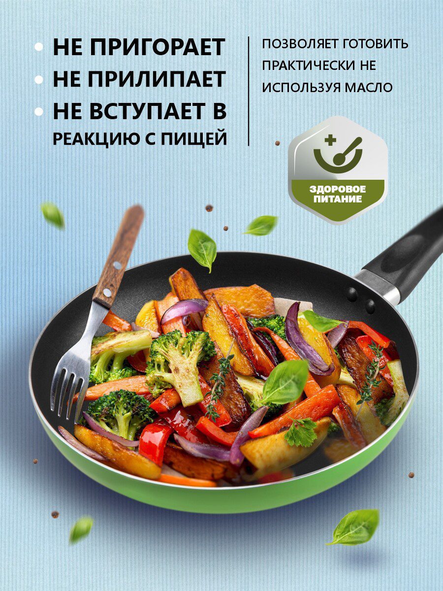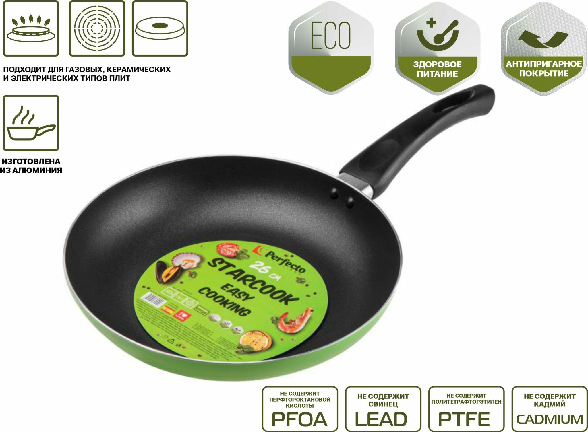 Сковорода алюминиевая 26 см PERFECTO LINEA Starcook зеленая (56-260451) изготовлена из алюминия с антипригарным покрытием Non-Stick Coating With Honeycomb, без использования перфтороктановой кислоты (PFOA). Не содержит свинец (LEAD), кадмий (CADMIUM), перфтороктановую кислоту (PFOA), политетрафторэтилен (PTFE). Не загрязняет окружающую среду. Подходит для газовых, керамических и электрических типов плит.