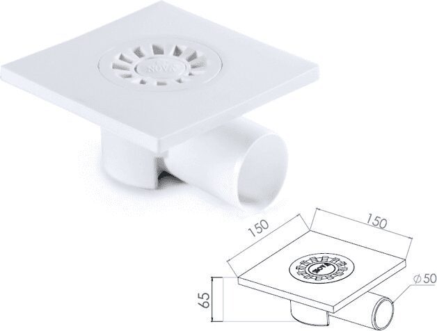 Трап сливной горизонтальный D 50 решетка пластиковая NOVA выполнен из качественного полипропилена. Диаметр горизонтального выхода в канализацию составляет 50 мм. Размер трапа: 150х150х65 мм.