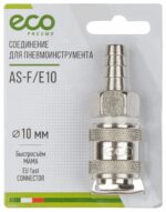 Соединение быстросъемное МАМА х елочка 10 мм ECO AS-F/E10 имеет автоматический клапан, перекрывающий канал и предназначено для установки на выходном конце пневматических шлангов с внутренним диаметром 10 мм для создания автоматических прерывателей подачи воздуха.