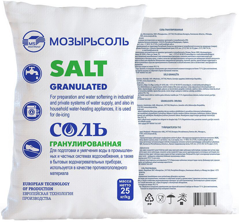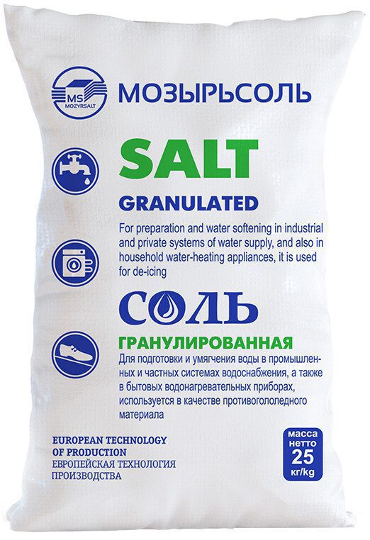 Соль техническая МОЗЫРЬ СОЛЬ 25 кг – это эффективное антигололедное средство, предназначено для уменьшения гололедных образований на дорогах. Реагент быстро плавит лед и улучшает коэффициент сцепления. Соль так же подходит для подготовки и умягчения воды в промышленных и частных системах водоснабжения, для бытовых водонагревательных приборов. Соль гранулированная изготавливается согластно ТУ РБ 400087365.007-2012. Массовая доля хлорида натрия не менее 99,5%.