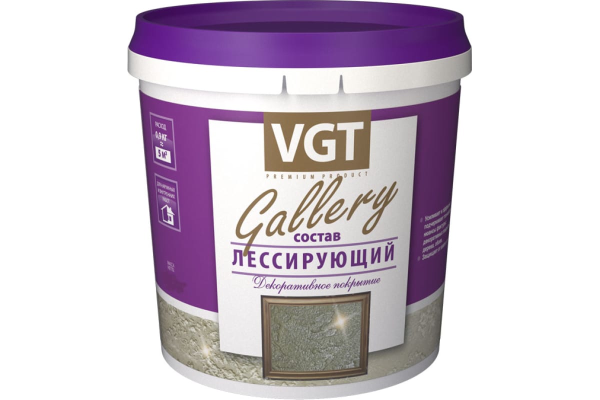 Состав лессирующий VGT Gallery полупрозрачный бронза 0,9 кг – это декоративное полупрозрачное покрытие, предназначенное для придания дополнительного оттенка или перламутрового эффекта как на фактурных, так и на гладких основаниях. Позволяет подчеркнуть контуры рисунка, обогатить цветовую гамму и усилить оттенки декоративного покрытия. Декоративная штукатурка применяется при отделке любых интерьеров: гостиные, вестибюли, рестораны, магазины, офисы и для наружных работ.