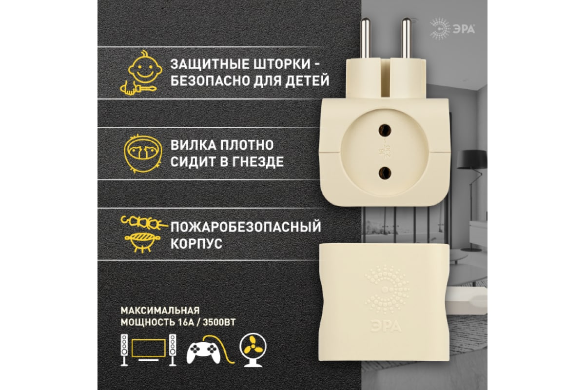 Тройник ЭРА SP-4-I 4гн, без заземления слоновая кость Б0008206 станет Вашим надежным помощником, если в Вашем доме недостаточно розеток, чтобы одновременно подключить несколько электроприборов. Электрический разветвитель рассчитан на максимальную мощность 16А/3500Вт. Корпус выполнен из ударопрочного и негорючего пластика (поликарбонат). Модель тройника на 16А позволяет подключить мощные бытовые приборы общей нагрузкой до 3500Вт. Не бойтесь включить чайник, обогреватель или микроволновку. Дизайн разработан в России командой Эра Style.