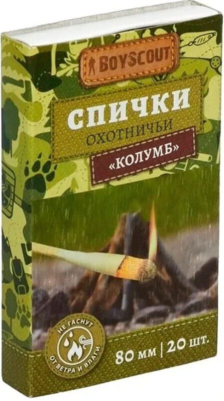Средство для розжига BOYSCOUT Спички Колумб (61033) горят даже после погружения в воду, а также гарантируют получение пламени при сильном ветре и дожде. Длина спички – 8 см. Сами спички выполнены из древесины, а на конце предусмотрен зажигательный состав. Огонь в походе, на рыбалке, охоте или пикнике является одной из важных составляющих, позволяющих обеспечить тепло и защиту. Поэтому спички и зажигалки должны быть в каждом рюкзаке, даже если вы не планируете ночевку в лесу.