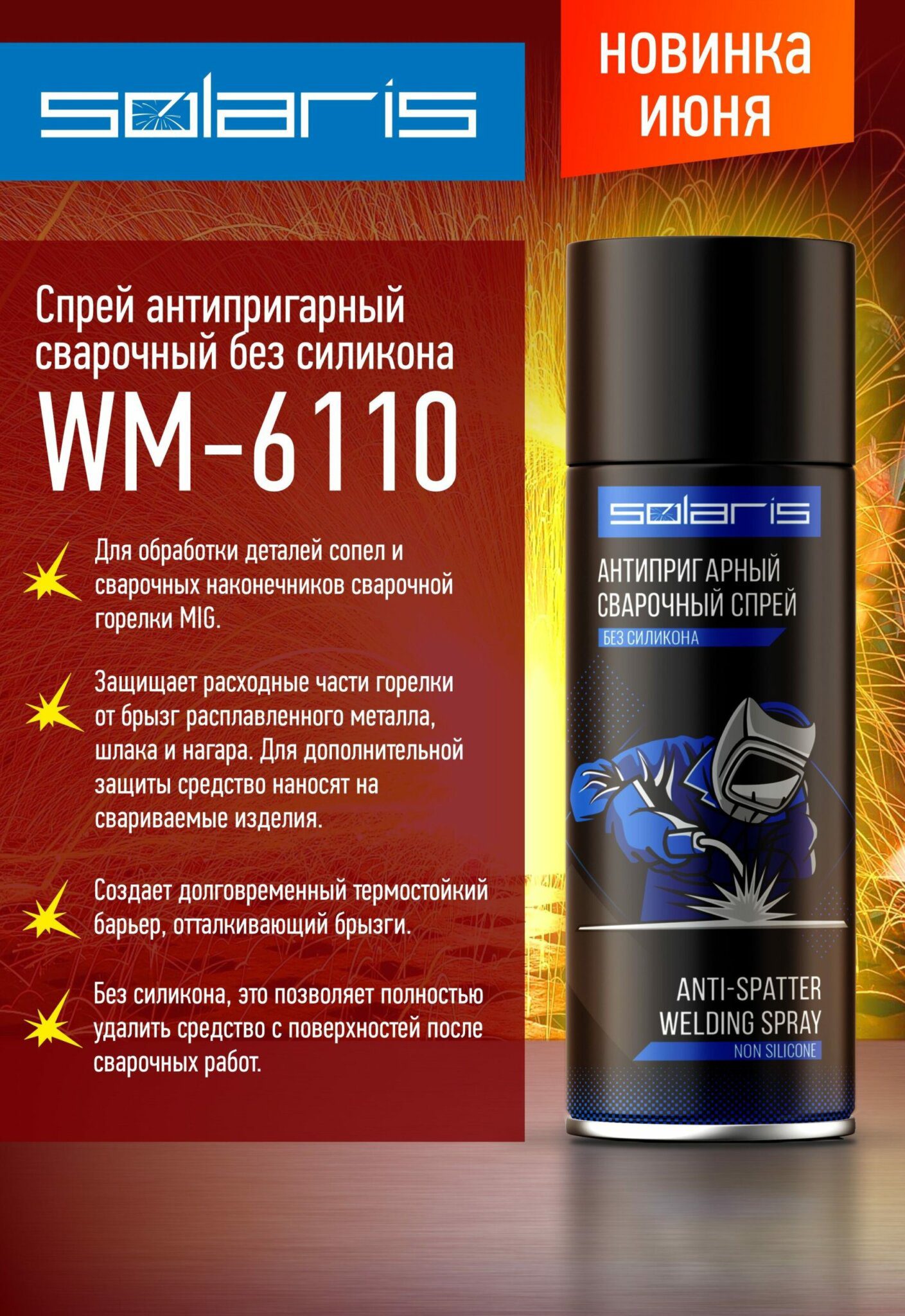 Спрей для сварки от налипания брызг SOLARIS WM-6110 используется для обработки деталей сопел и сварочных наконечников сварочной горелки MIG. Создает термостойкий барьер без применения силикона. Обладает длительным отталкивающим брызги действием. Увеличивает срок службы горелки. Повышает стабильность сварочной дуги, обеспечивая свободный газовый поток. Не снижает прочность сварочного шва. Экономичен в использовании благодаря тонкой пленке распыления.
