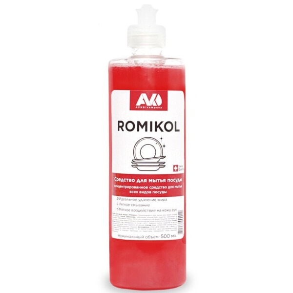 Средство для мытья посуды AVKO Ромикол 0,5 л предназначается для мытья всех видов столовой посуды вручную. Концентрированное моющее средство, эффективно в холодной воде, хорошо смывается, не оставляя разводов. Имеет приятный запах. Не оказывает раздражающего действия на кожу рук.