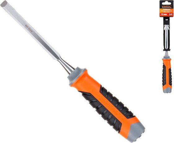 Стамеска плоская 10 мм STARTUL PROFI (ST4075-10) предназначена для проведения столярных и плотницких работ, таких как выдалбливание пазов и гнезд, снятие фасок и шлицов. Материал полотна: хромованадиевая сталь. Твердость рабочей кромки, HRC: 55. Рукоятка: трехкомпонентная обрезиненная. Затыльник: металлический.