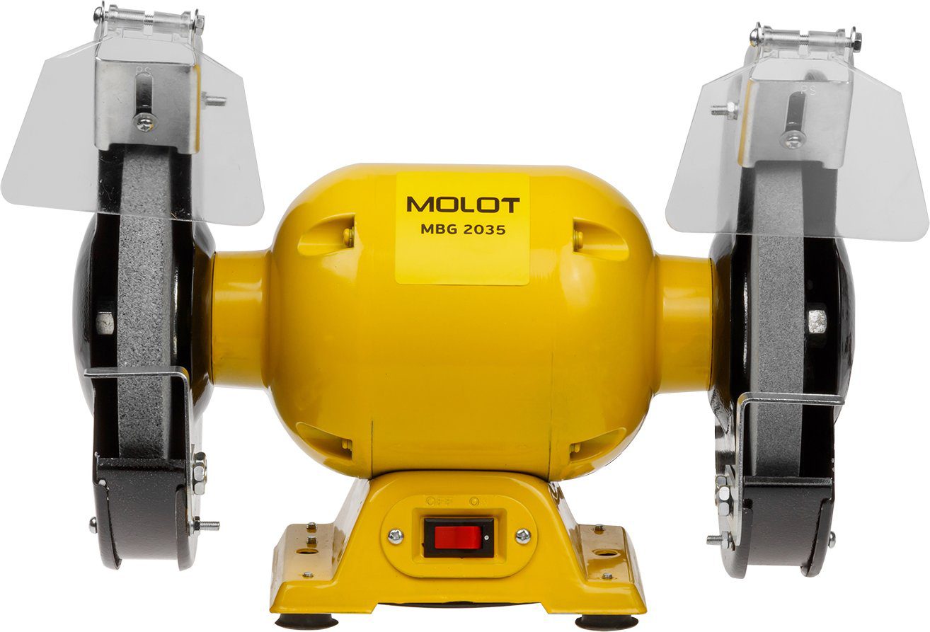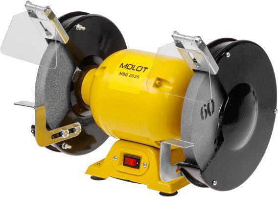 Станок точильный (точило) MOLOT MBG 2035 (MBG203500019) имеет мощный двигатель на 350 Вт. Устойчивое основание. Благодаря небольшому размеру и весу станок легко транспортировать. Предусмотрены защитные щитки для защиты от искр при заточке. Металлические защитные кожухи закрывают диски и не позволяют к ним случайно дотронуться.
