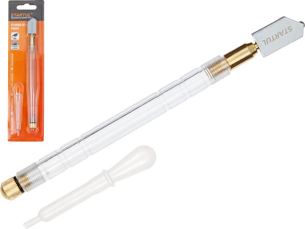 Стеклорез масляный STARTUL Profi (ST4960-01) предназначен для разрезания стекла толщиной от 2 до 10 мм. Стеклорез оснащен дозирующей колбой, заправляемой керосином, соляркой или веретенным маслом. В комплект входит пипетка, при помощи которой осуществляется заправка стеклореза. Масло подается всякий раз при нажатии на режущую насадку.