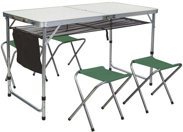 Набор мебели туристический ARIZONE (42-120653) – это складной стол и четыре табуретки. Стол 120х60 см имеет три положения 53/60/70 см. Выполнен стол из алюминия и МДФ. Размеры табуретки 25х30х35 см. Компактный складной набор станет незаменимым помощником на любом пикнике и в загородных поездках. Максимальная нагрузка стола: 35 кг. Максимальная нагрузка стула: 100 кг. Карман для мелочей в комплекте.