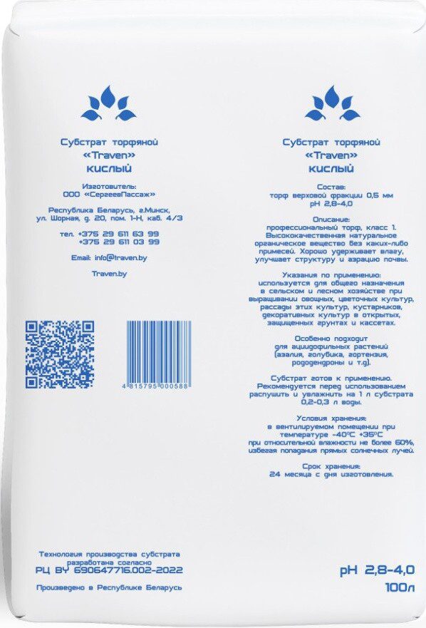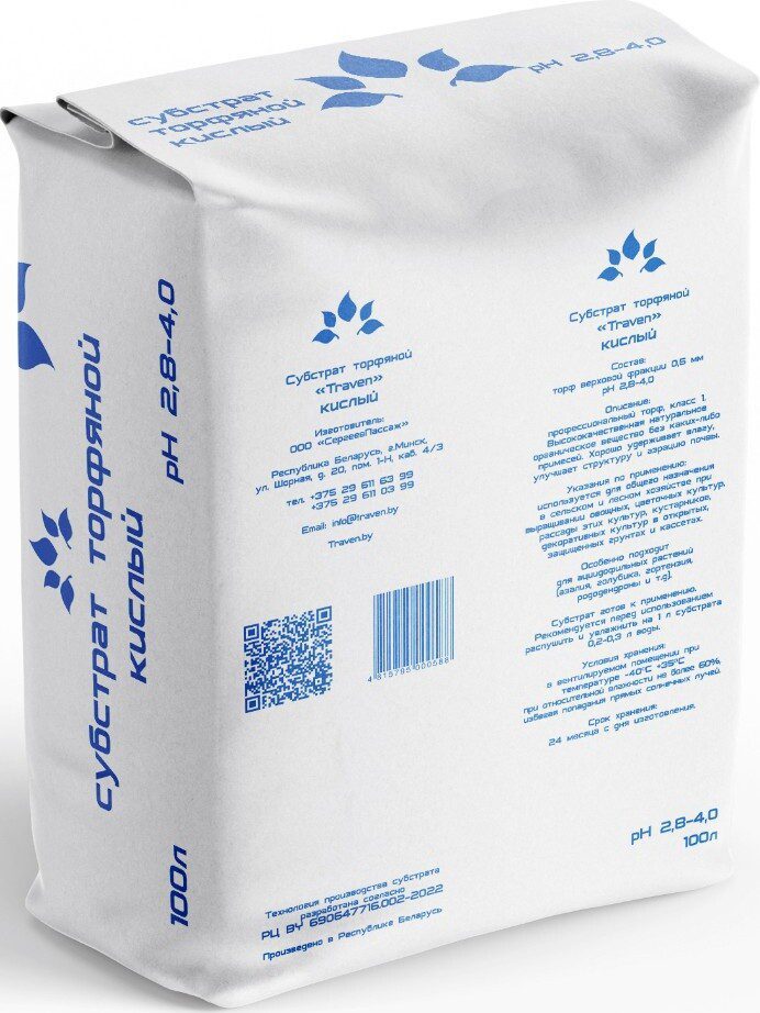 Субстрат торфяной TRAVEN кислый рН 2,8-4,0 100 л – это профессиональный торф, класс 1. Высококачественное натуральное органическое вещество без каких-либо примесей. Хорошо удерживает влагу, улучшает структуру и аэрацию почвы.Указания по применению: используется для общего назначения в сельском и лесном хозяйстве при выращивание овощных, цветочных культур, рассады этих культур, кустарников, декоративных культур в открытых, защищенных грунтах и кассетах. Особенно подходит для ациидофильных растений (азалия, голубика, гортензия, рододендроны и т.д). Субстрат готов к применению. Рекомендуется перед использованием распушить и увлажнить на 1 л субстрата 0,2-0,3 л воды.