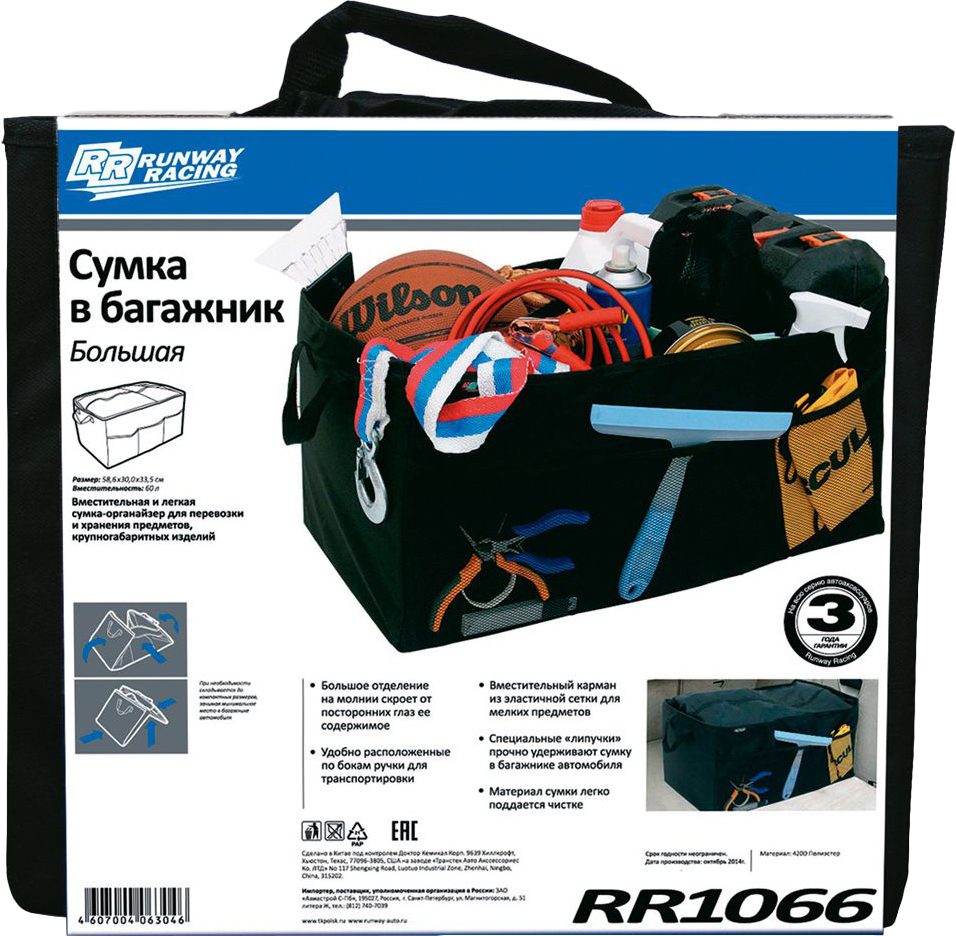 Сумка в багажник RUNWAY RACING (RR1066) – вместительная и легкая сумка-органайзер для перевозки и хранения предметов, крупногабаритных изделий. Большое отделение на молнии скроет от посторонних глаз ее содержимое. Удобно расположенные по бокам ручки для транспортировки. Вместительный карман из эластичной сетки для мелких предметов. Специальные «липучки» прочно удерживают сумку в багажнике автомобиля. Материал сумки легко поддается чистке.