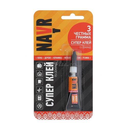 Суперклей NAVR 3 гр (13723) – классический 100% супер клей обеспечивает мгновенное соединение материалов. Клеевой шов устойчив к влаге и органическим растворителям. Со временем качество клеевого соединения не теряет своей прочности и свойств. Универсален. Им можно склеить: керамику, металл, пластик, резину, дерево, кожу.