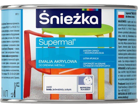 Эмаль акриловая SNIEZKA Supermal A400 белая 0,4 л (91015121) предназначена для декоративно-защитной окраски древесины, древесных материалов, штукатурки и элементов из стали и чугуна, применяемых внутри и снаружи помещений, таких как: двери, окна, мебель и т.д. Возможна окраска игрушек и игрового оборудования. Разбавляется водой, быстро сохнет. Устойчива к погодным условиям, имеет повышенную износостойкость, отличную укрывистость и адгезию к основанию.