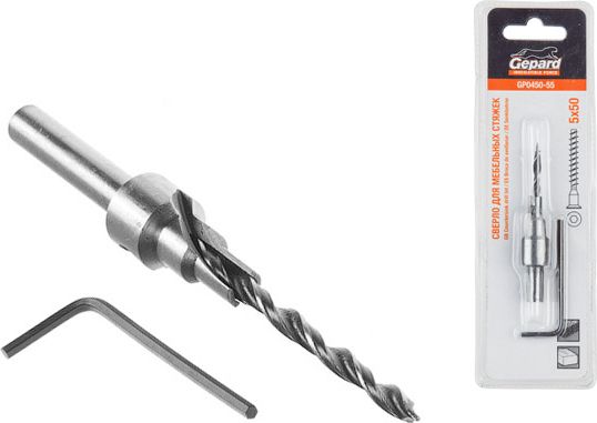 Сверло для конфирматов 5х50 мм GEPARD (GP0450-55) для сверления отверстий под мебельную стяжку (конфирмат) за один проход в дереве, ДСП, ДВП. Обеспечивает зенкование под потайную шляпку. Параметры стяжки, мм 5х50 ммДиаметр сверла 4 ммЗенкер 6.5 мм