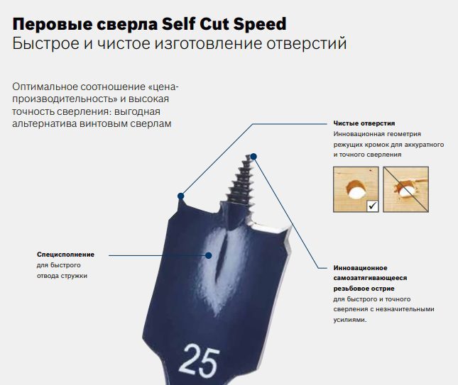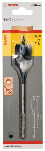 Сверло по дереву перьевое 26х152 мм BOSCH (2608595495) для мягкой и твёрдой древесины, а также лёгких строительных материалов, таких как гипсокартон. Сверлит в три раза быстрее по сравнению со стандартным плоскофрезерным сверлом. Самозатягивающееся резьбовое острие. Изготавливается по собственному заводскому стандарту из специально улучшенной стали. Точно заточенное острие и режущие кромки для соблюдения точных размеров отверстий.
