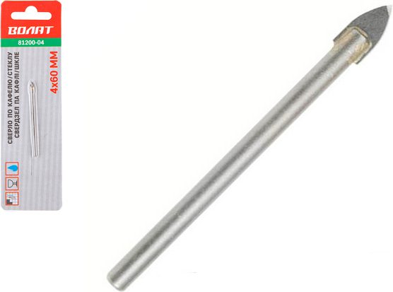 Сверло по кафелю и стеклу 4х60 мм ВОЛАТ (81200-04) Предназначено для сверлени кафеля, стекла, керамической плитке. Покрытие полимерное (порошковое) для защиты от коррозии. Цилиндрический хвостовик.