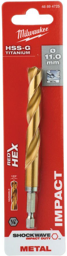 Сверло по металлу 11,0x81x125 мм MILWAUKEE HSS-G-TIN (48894725) с 1/4″ шестигранным хвостовиком оптимизировано для шуруповертов и ударных винтовертов. Угол заточки 135° уменьшает гуляние при засверливании. Конструкция шнека позволяет быстрее выбрасывать стружку. Титановое покрытие распределяет тепло для большей эффективности.