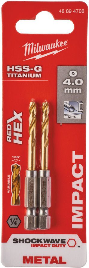Сверло по металлу 4,0х26х71,5 мм 2 штуки MILWAUKEE HSS-G-TIN (48894708) с 1/4″ шестигранным хвостовиком оптимизировано для шуруповертов и ударных винтовертов. Угол заточки 135° уменьшает гуляние при засверливании. Конструкция шнека позволяет быстрее выбрасывать стружку. Титановое покрытие распределяет тепло для большей эффективности.