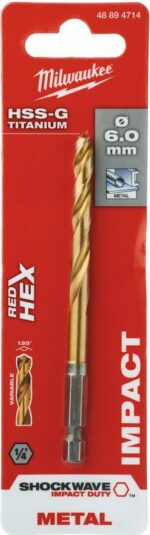 Сверло по металлу спиральное 6х63х105 мм MILWAUKEE HSS-G-TIN (48894714) с 1/4″ шестигранным хвостовиком оптимизировано для шуруповертов и ударных винтовертов. Угол заточки 135° уменьшает гуляние при засверливании. Конструкция шнека позволяет быстрее выбрасывать стружку. Титановое покрытие распределяет тепло для большей эффективности.