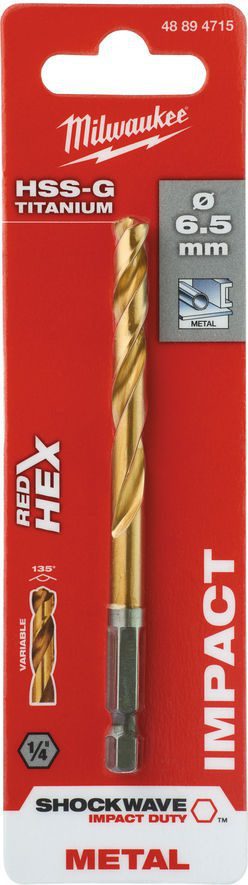 Сверло по металлу 6,5х63х107 мм MILWAUKEE HSS-G-TIN (48894715) с 1/4″ шестигранным хвостовиком оптимизировано для шуруповертов и ударных винтовертов. Угол заточки 135° уменьшает гуляние при засверливании. Конструкция шнека позволяет быстрее выбрасывать стружку. Титановое покрытие распределяет тепло для большей эффективности.