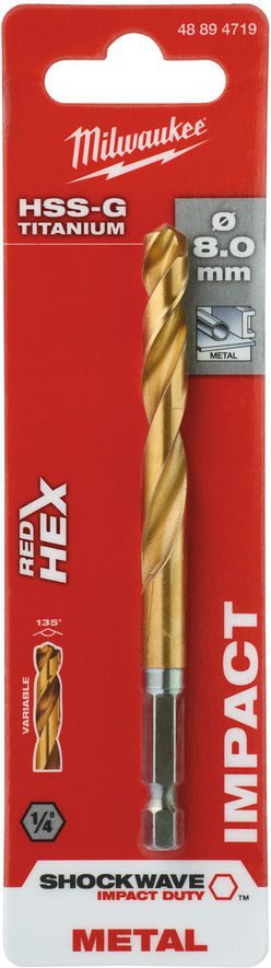 Сверло по металлу 8,0х67х111 мм MILWAUKEE HSS-G-TIN (48894719) с 1/4″ шестигранным хвостовиком оптимизировано для шуруповертов и ударных винтовертов. Угол заточки 135° уменьшает гуляние при засверливании. Конструкция шнека позволяет быстрее выбрасывать стружку. Титановое покрытие распределяет тепло для большей эффективности.