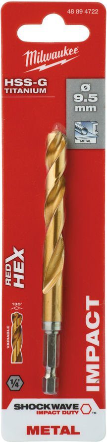 Сверло по металлу 9,5×74х118 мм MILWAUKEE HSS-G-TIN (48894722) с 1/4″ шестигранным хвостовиком оптимизировано для шуруповертов и ударных винтовертов. Угол заточки 135° уменьшает гуляние при засверливании. Конструкция шнека позволяет быстрее выбрасывать стружку. Титановое покрытие распределяет тепло для большей эффективности.