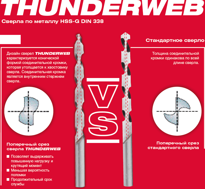 Сверло по металлу 10,5x87x133 мм MILWAUKEE Thunderweb HSS-G (4932352368) характеризуется конической формой соединительной кромки, которая утолщается к хвостовику. Соединительная кромка является внутренним стержнем сверла. Сверло Thunderweb позволяет выдерживать повышенную нагрузку и крутящий момент, имеет меньшую вероятность поломки и продолжительный срок службы. Геометрия сверла способствует быстрому удалению стружки. Открытая форма шнека снижает сопротивление, что особенно важно при сверлении глубоких отверстий. Заостренные режущие кромки обеспечивают чистое и быстрое сверление. 135° на режущей части позволяют совершать точный запуск, быстрое проникновение, требуют меньше усилий / давления подачи. Сверло отлично подходит для бурения на изогнутых поверхностях. DIN 338.