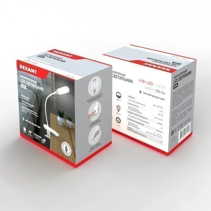 Лампа настольная светодиодная Click 4 Вт 4000К REXANT на прищепке (609-001) используется для освещения рабочего места. Современный дизайн придаст изысканность любому интерьеру, а высокое качество светодиодного источника света без пульсаций позволяют использовать светильник как в офисе, так и дома. Матовый рассеиватель обладает антиослепляющим эффектом и уменьшает габаритную яркость, создавая равномерный и мягкий свет. Светильник заряжается от источника питания 5 В постоянного тока (не входит в комплект) через универсальный порт micro USB. Светильник оснащен аккумулятором, благодаря которому может работать до 3 часов при отсутствии питания от сети.