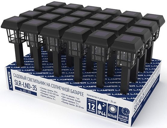 Светильник садовый на солнечных батареях SLR-LND-35 LAMPER (602-203) подходит для подсветки газонов, цветников и дорожек. Данный светильник, сделанный из пластика, имеет высокие эксплуатационные показатели, что объясняется его повышенной стойкостью к механическим повреждениям и защищенностью от факторов внешней среды. Отсутстствие внешних проводов делает данный светильник простым в установке и мобильным в перемещении. Эти светильники являются выгодным декором дачного участка благодаря своему неповторимому дизайну, который придает комфорт и уют атмосфере сада или двора.