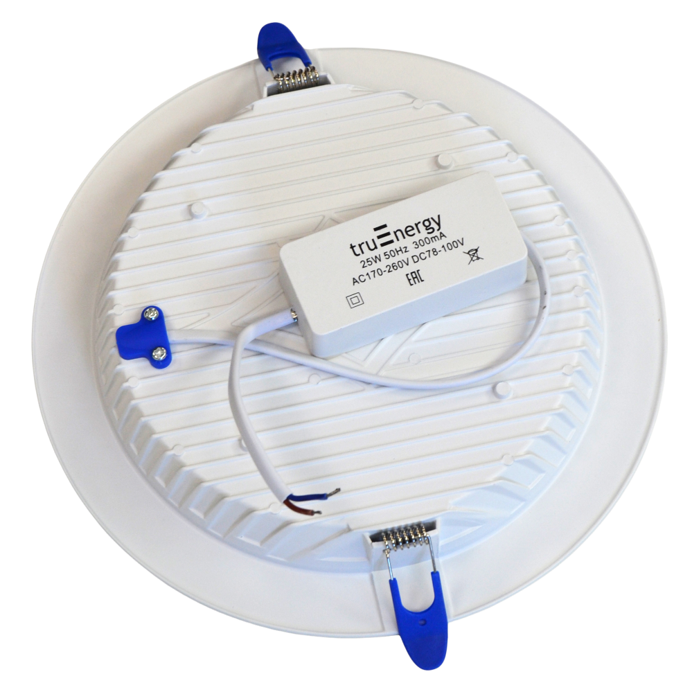 Светильник встраиваемый светодиодный 25 Вт 4000К TRUENERGY Basic белый (10464) обладает нейтральным цветом свечения, который прекрасно подходит и как для жилых помещений и комнат, так и для рабочих зон (офисов, кабинетов, производств). Данный свет стимулирует к работе не вызывая перенапряжения глаз и не искажая цветопередачу. Универсальное и наиболее распространенное решение.Устройство устанавливается в предварительно вырезанное в поверхности отверстие.
