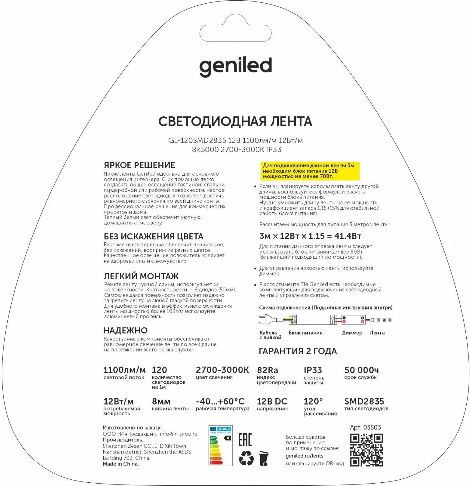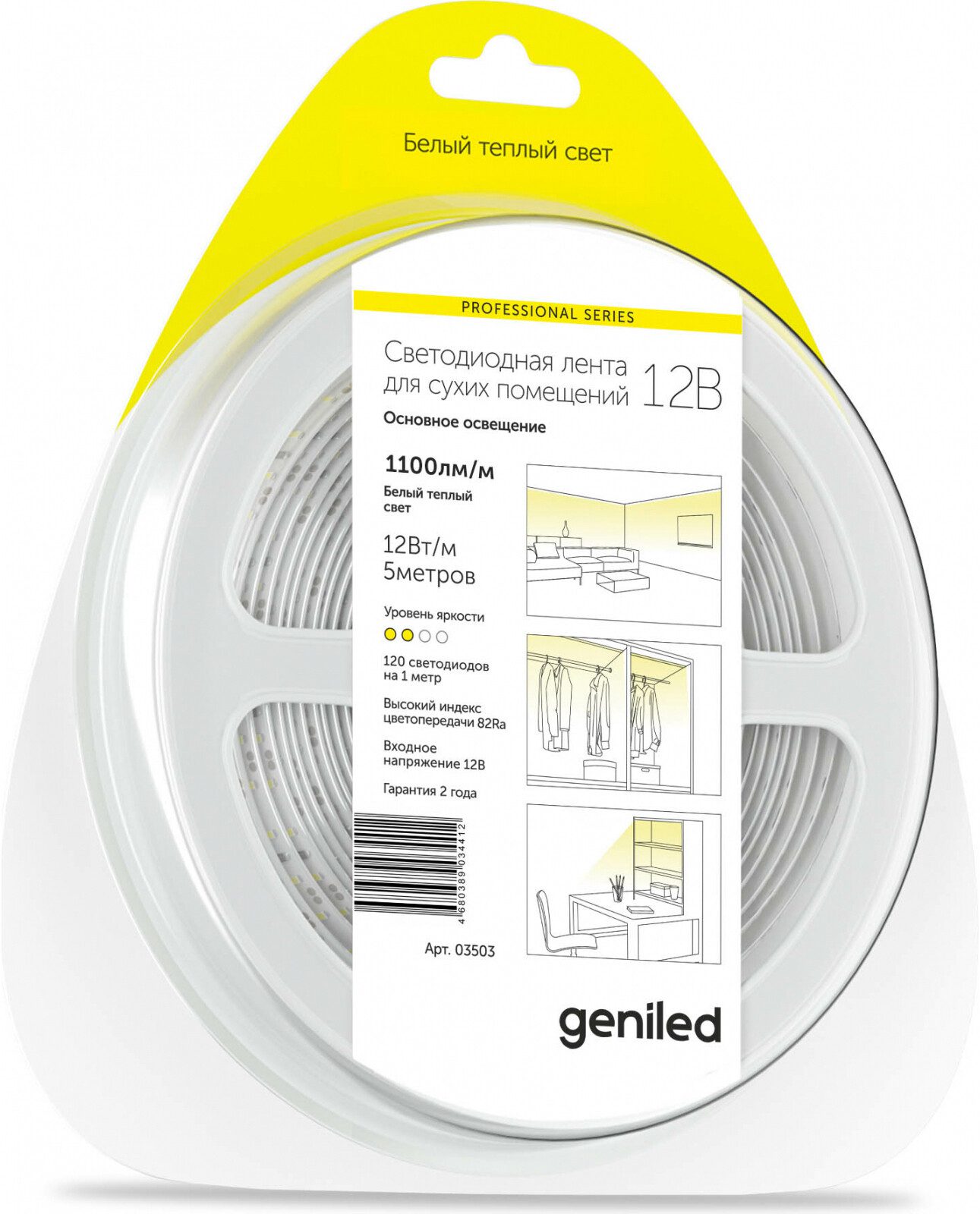 Лента светодиодная 2835 12 Вт/м 2700-3000 К IP33 12 В 5 м GENILED (03503) идеальна для основного освещения интерьера. С ее помощью легко создавать общее освещение гостиной, спальни, гардеробной или рабочей поверхности. Частое расположение светодиодов позволяет достичь равномернго свечения по всей длине. Возможно отрезать ленту нужной длины. Самоклеящаяся поверхность позволяет надежно закрепить ленту на любой гладкой поверхности. Для управления яркостью используйте диммер (приобретается отдельно).
