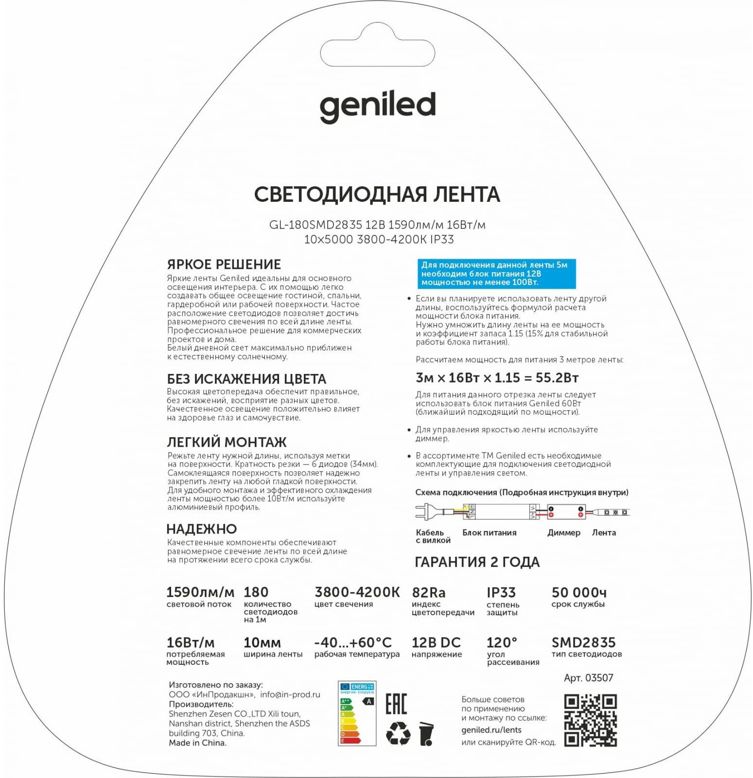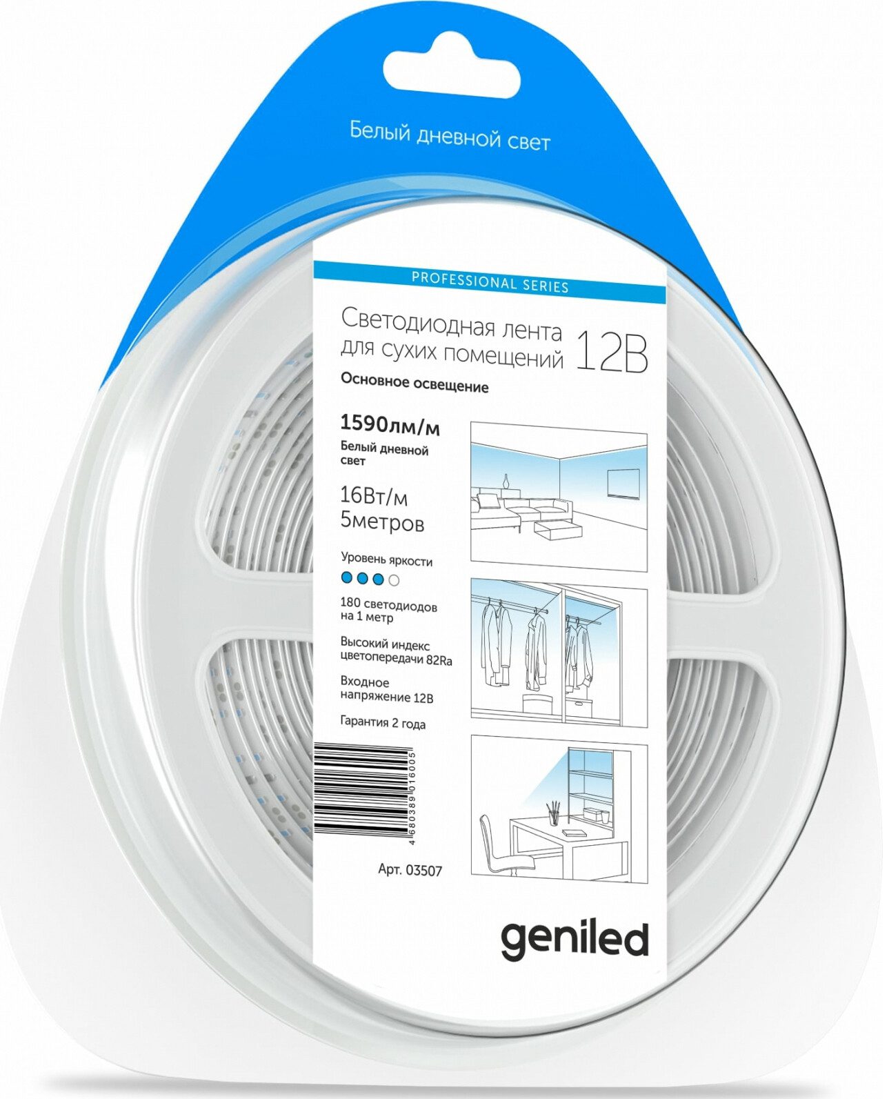 Лента светодиодная 2835 16 Вт/м 3800-4200 К IP33 12 В 5 м GENILED (03507) идеальна для основного освещения интерьера. С ее помощью легко создавать общее освещение гостиной, спальни, гардеробной или рабочей поверхности. Частое расположение светодиодов позволяет достичь равномернго свечения по всей длине. Возможно отрезать ленту нужной длины. Самоклеящаяся поверхность позволяет надежно закрепить ленту на любой гладкой поверхности. Для управления яркостью используйте диммер (приобретается отдельно).