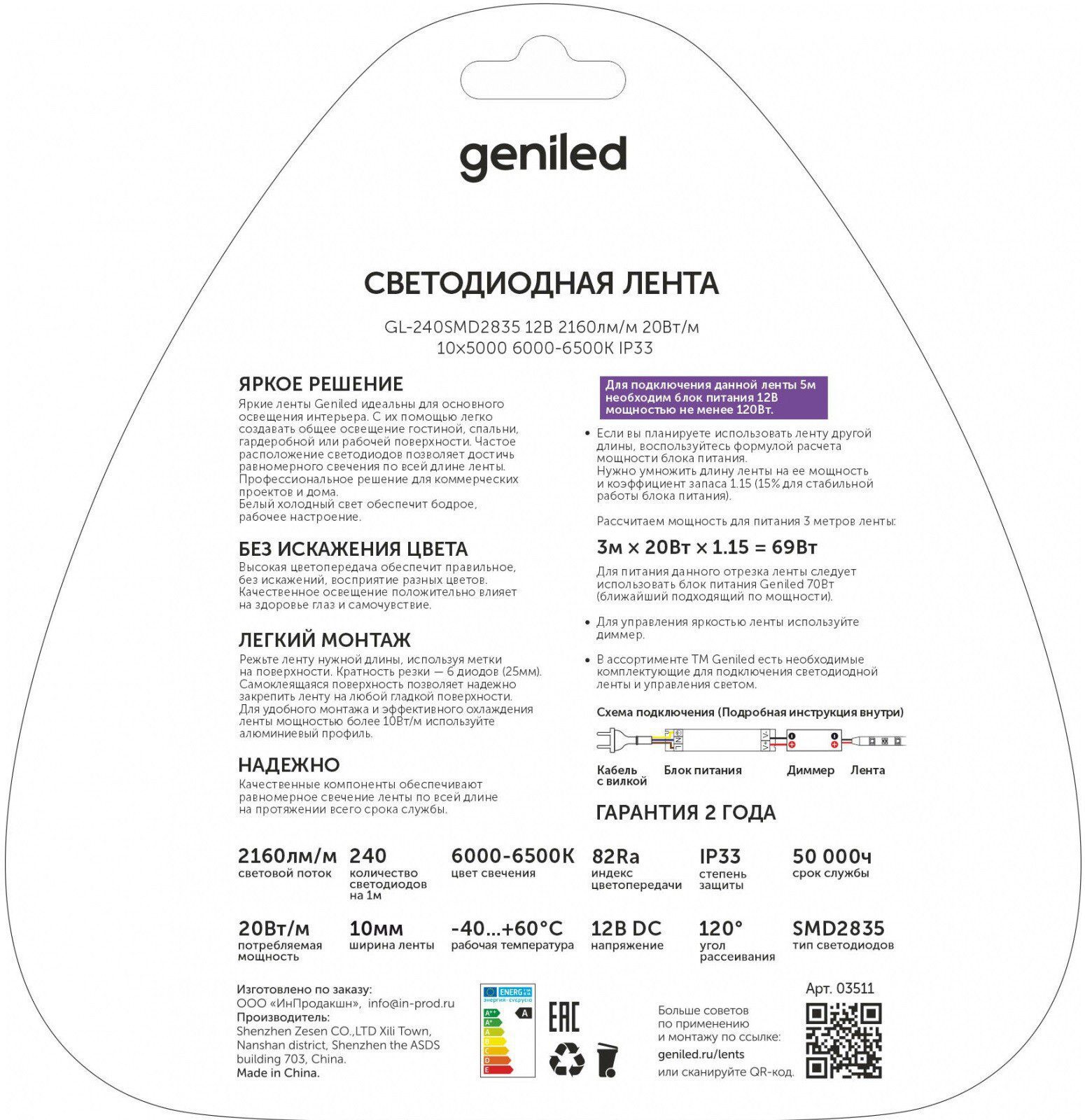 Главная Освещение Ленты светодиодные Светодиодная лента Geniled GL-240SMD2835 12В 2160лм/м 20Вт/м 10х5000 6000-6500К IP33